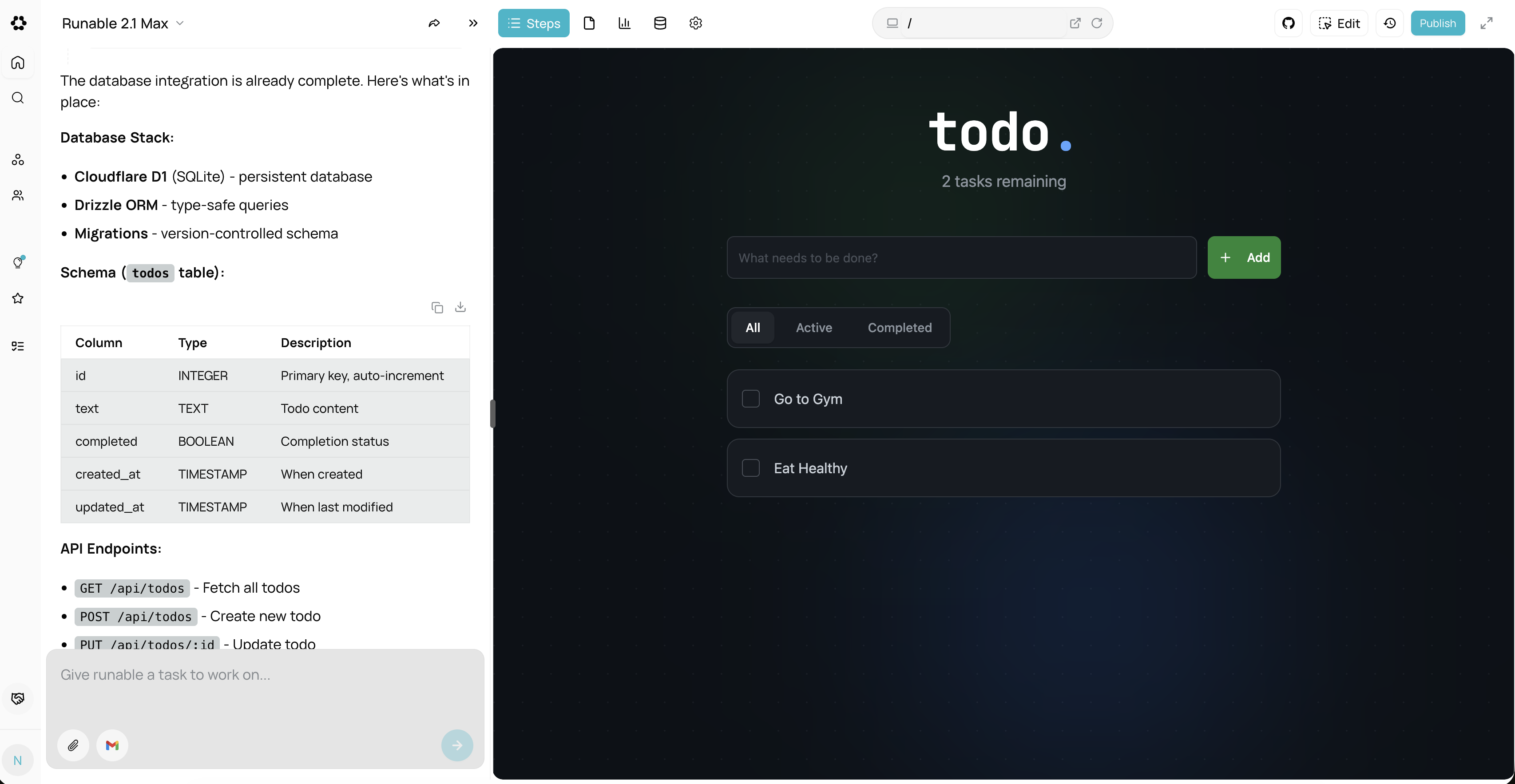 your own SQLite database, dedicated file storage, custom domain support, full source code access, automatic version control, and global deployment on Cloudflare Workers.